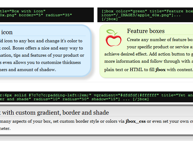 [jbox color=”blue” title=”Box with icon” icon=”/_IMAGES/gleb_60x.png” border=”5″ radius=”35″ shadow=”9″]Sample Box[/jbox]